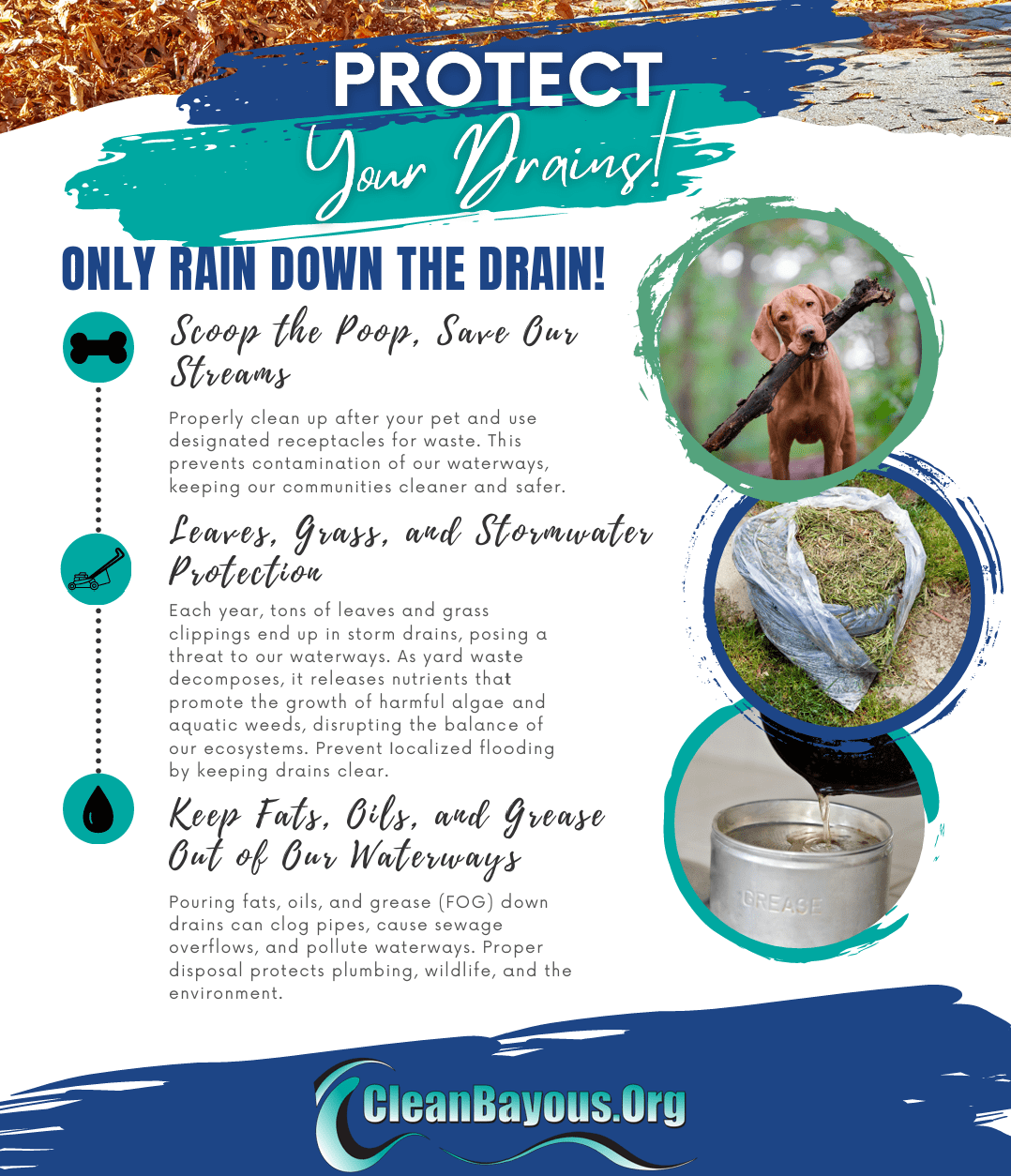 Transport of Harmful Chemicals: Grass and leaves may carry fertilizers, pesticides, or herbicides. When these chemicals enter storm drains, they flow untreated into waterways, contaminating the ecosystem and harming wildlife.